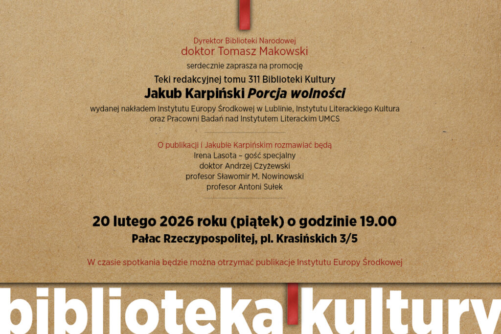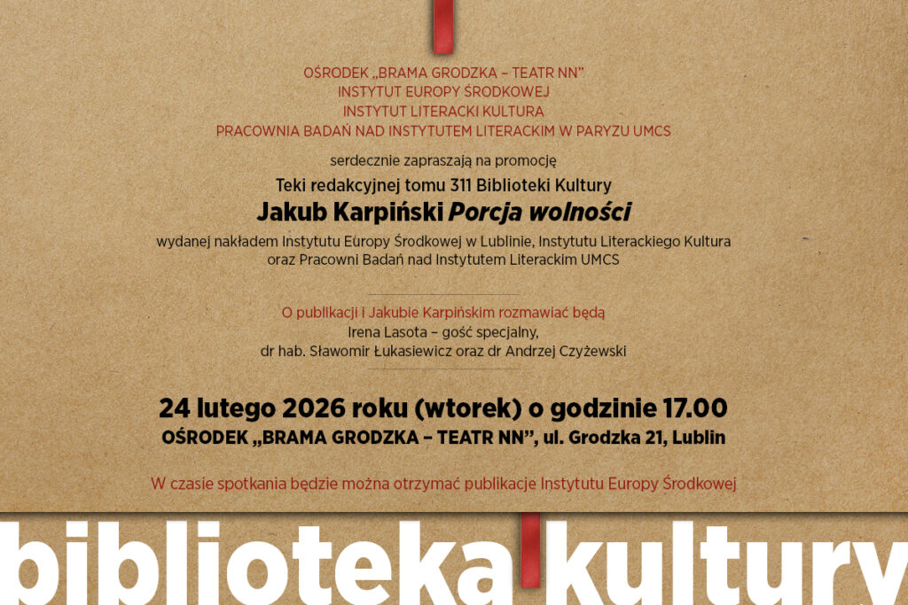 The launch of the editorial portfolio of Volume 311 of the “Biblioteka Kultury” series, Jakub Karpiński. Porcja wolności, published by the Institute of Central Europe, the Kultura Literary Institute, and the UMCS Research Laboratory on the Literary Institute.
