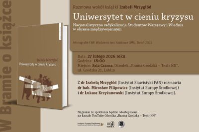 The Institute of Central Europe, the “Brama Grodzka – Teatr NN” Centre, and “Historia BEZ KITU” warmly invite you to the next event in the W Bramie o książce series. This meeting will be devoted to Dr. Izabela Mrzygłód’s latest book, Uniwersytet w cieniu kryzysu. Nacjonalistyczna radykalizacja studentów Warszawy i Wiednia w okresie międzywojennym...